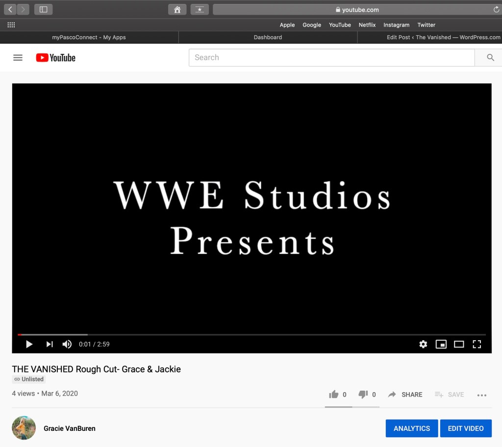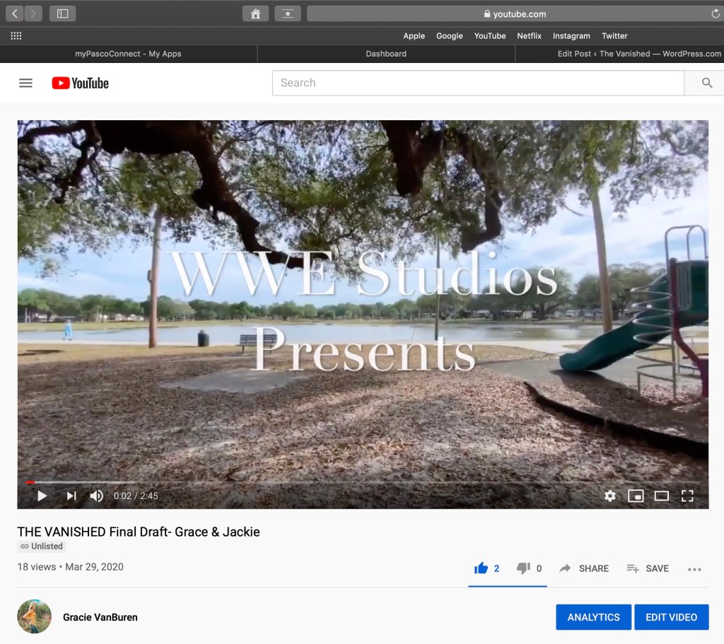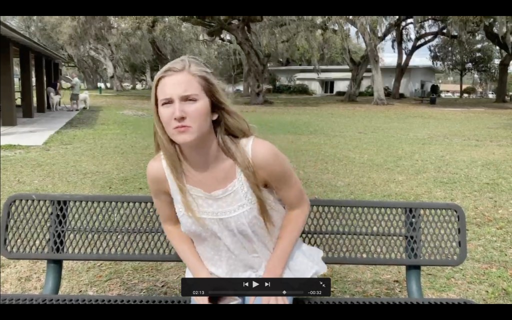 Hello everyone, my name is Grace VanBuren and this is my creative critical reflection on our opening scene of “The Vanished”. Before I begin to answer my questions, I would like to quickly thank you for keeping up with this film-making journey Jackie and I have worked so hard on. We are so happy with how our film is turning out and are so excited to share it with you. First off, I would like to refresh you on whatour film is about. The Vanished is a dramatic thriller that takes place at Zephyr Park in Zephyrhills Florida. On one bright and sunny day, a mom and her three year old daughter are at the park and the toddler is playing on the playground. The mother gets sidetracked by her phone and loses attention of the child. Sawyer, who is the three year old girl, is just happily playing on the playground by herself having a good time. Grace, her mother, is still on her phone not paying attention to Sawyer. Moments pass by and a large white truck pulls into the parking lot. A suspicious man gets out of the truck and slowly walks towards the playground that Sawyer is playing on. The film goes on with Grace still being on her phone and the suspicious man eventually walking away, with Sawyers hand in his. The mother then looks up to check on her daughter, and she is no where to be found.